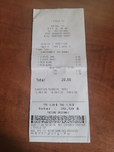 Read moreMon expérience à l'étoile 131 a été décevante à bien des égards. Non seulement la crêpe que j'ai commandée était brûlée, mais j'ai également découvert des cheveux dans nos œufs. De plus, l'eau était servie sans glace, le chocolat chaud était préparé avec de la poudre à chocolat qui n'était pas complètement dissoute, et le prétendu sirop d'érable s'est avéré être du sirop de maïs, ce qui est une déception dans le contexte québécois. Pour parfaire ce tableau peu reluisant, la serveuse s’est montrée singulièrement indiscrète lors du règlement de l’addition. Cette expérience globale se révèle décevante, dérogeant sensiblement aux normes que l’on est en droit d’attendre d’un établissement de...