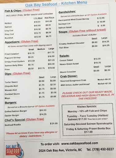 The Okay Fish Tacos (Tuesday Special) - Quality fish! Fresh! Great flavour! Well cooked! But the taco shell, salsa, and slaw paired with it was underwhelming. Large size, loaded with a massive amount of meat which was appreciated but unfortunately left the taco unbalanced. Would prefer 3/4 tacos with less meat each. Got both Halibut & Salmon, each has a different marinade/treatment, otherwise the same toppings. Have to commend Oak Bay Seafood for updating their app menu with limited availability specials!
