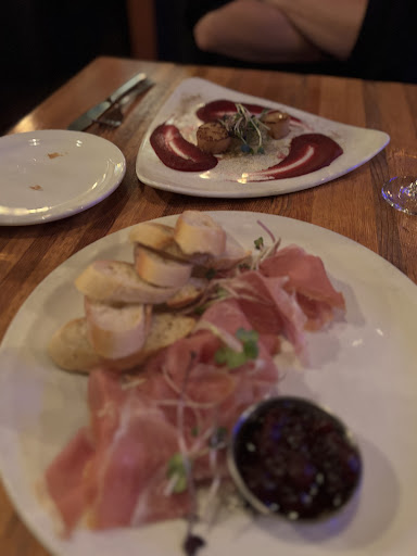 Service: My spouse was not so well treated. My spouse ordered a cocktail from the previous cocktail menu (That had changed within the last couple of days, and the drink she ordered is still on their website) thinking that their advertising on their website was legitimate: Vis-a-Vis says that they're happy to make cocktails from previous menus and that they keep all the old recipes on hand just in case one is desired. Our server, named Mishka, balked at my spouse ordering a drink from a previous menu, wasn't interested in putting in the least bit of effort to make the drink order happen (no suggestions, no questions about the recipe, not apologetic that it "wasn't available"), she only pretended to go ask the bartender (she just went to the bar and waited for 5 seconds without speaking to the bartender) if he could make it, and came back saying "He doesn't know" after my spouse mentioned what the website said about making older recipes. My spouse was disappointed as she wanted the drink she had seen on their website and had assumed that their promise of making older recipes was genuine. She ordered something else instead and was not satisfied. She also ordered a Chacuterie and Fromage board for herself, which did not arrive when my food did. It was obvious that when my food was delivered that there had been a mistake in the kitchen and that her food had not been made, though they were aware of the order. We had an awkward 10 minutes while the restaurant staff was staring at us and talking whilst a few cooks panicked in their haste to cut chacuterie and cheese for her. They delivered her food just over 10 minutes after my food arrived, and didn't seem apologetic or offer any recompense for the awkwardness or inconvenience. Also our table ended up being quite cluttered as the servers never bothered to clear our appetizer plates/flatware.