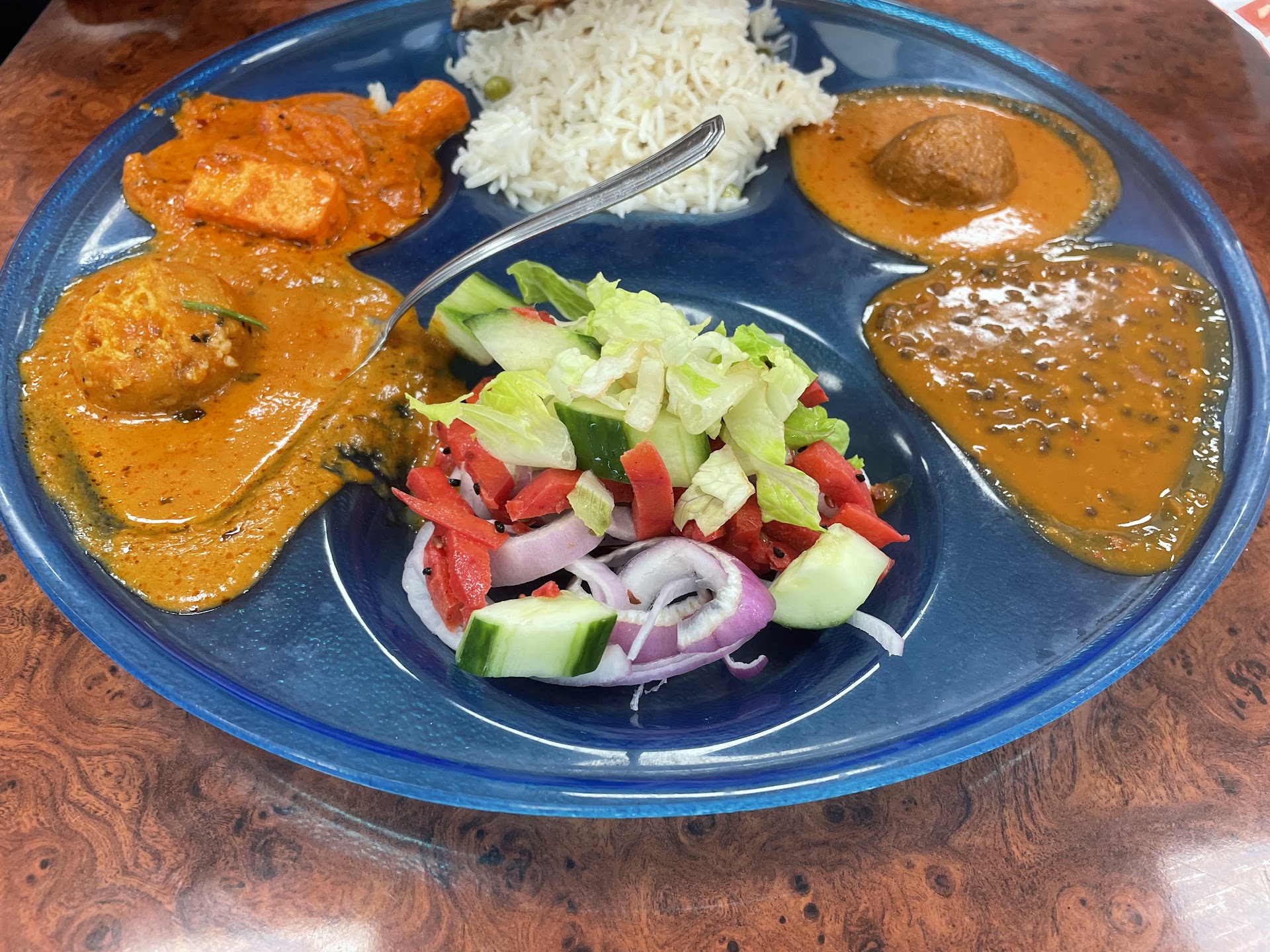 The family had Palak Paneer and Malai Kofta, a Mixed Vegetables and Mutter Paneer and the third one with just Cumin Potatoes (one of the four item that is marked as Vegan) The 2 two item were with Naans and the one item with Rotis without butter to make it vegan. The Samosa Chaat also without the Green Spicy Chutney as it has yogurt to make it Vegan. The Cumin Potatoes were too dry to eat and gets to you after a couple of bites. Will stick Chole or Daal the next time.