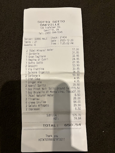 Went to Sotto Sotto Oakville on Feb 9th this year for our twins BDay dinner as a party of 4. We were literally the only customers in the restaurant that night due to the NFL game. You would think that our food would be great top notch for a restaurant at this price point.