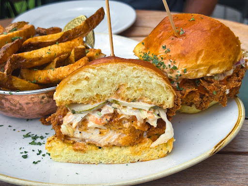 Next, I want to talk about the menu and the food. AMAZING! The menu has so many options. There’s definitely something for everyone, but it’s interesting. It’s not just pub grub, it’s elevated and every single item that we chose from the menu was scrumptious. Everyone loved their choices. The hamburger was split between two adults and it was so big it was actually plenty for both of them. They ordered it with sweet potato fries that were crispy and delicious. Two other folks ordered the lobster grilled cheese sandwich and the lobster pieces were generous and moist. When I come back, that is what I am ordering! The calamari were perfectly prepared, crispy, and light in the correct type of batter. The lamb shank was a huge portion and was melt in your mouth fall off the bone delicious.