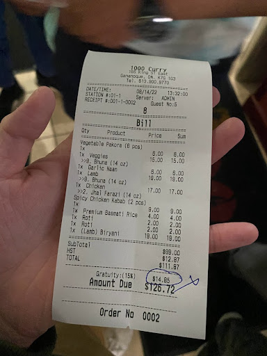 Read more1000 Curry is nothing else but 1000 disappointments. My wife and I went there for dinner on Friday July 8th and it was a ripped off. First impression of the place is already a bad one. The place looked like in need of some urgent decoration. Cheap plastic table and chairs scattered all over the place. We waited by the entrance and nobody bother to greet us and offer a table. I had to actually walked over the counter and asked if we can have a table for 2. Looking how unattractive is inside we decided to sit on the patio. The patio was empty except for 2 guys finishing their drinks. Dirty dishes all over the other tables. The waitress just packed all the dirty dishes on 1 table, wipe out one table and here you go. She came back 15 minutes later and took the order. I ordered a beer in the meantime. 40 minutes later no sign of the dinner or the waitress. I actually have to walked inside and ordered another beer until the dinner arrives. When the dinner finally arrived it was pretty shocking how this place doing business. My wife ordered a chicken korma and I ordered lamb cooked in tomato sauce with onions and peppers. The waitress doesn't know which one is which. She gave my wife the lamb and the chicken to me. The chicken Korma looked like anything but a chicken korma. The lamb came in a sauce looked more like a soup and no veggie to be found. The food was not fresh, tasted like frozen foods that have just been warmed up in a a microwave. Not to mentioned you have to pay extra for naan and rice. I been to Indian restaurant for years, I am actually part Indian myself but this place is an insult to Indian food. Do yourself a favor go next door to McDonald or KFC at least you know...