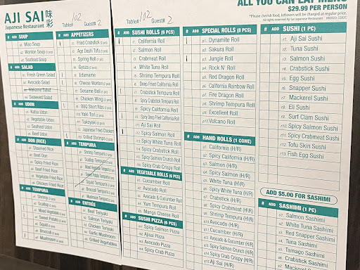 Read moreI have had such a wonderful experience in this restaurant. My husband and I came here for lunch for the first time. I can't remember the last time I ate at Aji Sai although, I know the last location is in Toronto, years before Covid. We decided to do all you can eat menu. We ordered tuna rolls and it became one of my favorites from that day on. The server is a really nice lady, she gave us the options on the menu, and how to order the foods we'd like to have. They have good seaweed salad and miso soup. The sushi options are a lot some of the best ones are spicy tuna roll, regular tuna roll, california, dynamite roll, california rainbow roll, mango avocado sushi(really good). Tempura of course, we can't forget shrimp tempura one of the best and the broccoli tempura too. These are the ones I had during this visit. Few notes for doing all you can eat: You have to pay for the number of sushi you don't eat or left over you have to pay $1 each so it is best to order 2 or 3 sets at a time. Make sure you leave enough time because it takes time to prepare your orders. Remember to make sure you eat everything you order to avoid paying extra. Make sure you are actually ready to eat a lot otherwise you can stick to bento box or set meal. Other than that, our overall experience was good. It was also a sunny day, we sat beside the window, the sunlight glares so it is really nice during winter days when most days seem gloomy during that week. For the next visit I'll add...