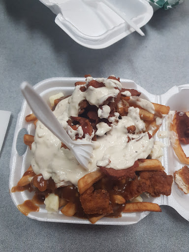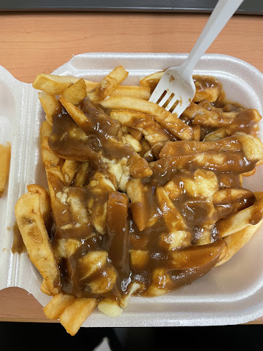 The poutine was okay. It was in a round soup container, and the cheese was really stringy. I'm not sure if it was real cheese curds or not. New York Fries offers a better poutine though. Fortunately the pizza was mostly decent. Good crust, and decent toppings. Terrible can-sauce that tastes like the kind you get with those make-your-own pizza kits.