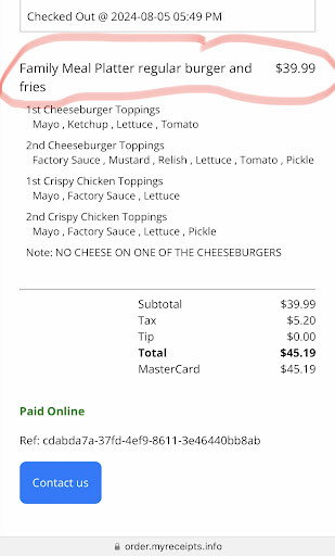 The sweet potato fries were good taste wise, but they were soggy. We will attribute this mostly due to using a third party to deliver the food and not being eaten right away, but still disappointing.