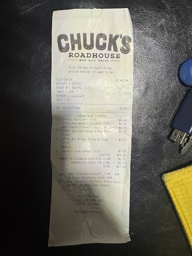 The ambiance at the Clarke Road Chuck's Roadhouse is inviting, and the staff has always been friendly and attentive during our visits. We appreciate the casual and comfortable atmosphere, which complements the overall dining experience.