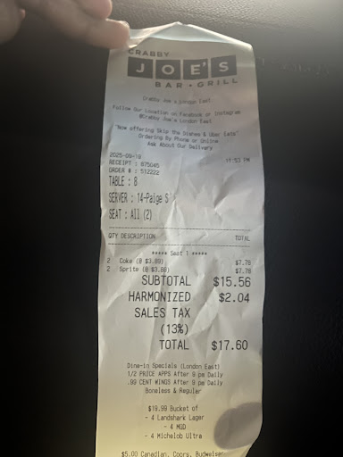 Read moreSorry for length, start to finish. My family and I had gone with the intention to get half priced appetizers for all 6 of us, large family looking to save a buck. When we got there on a Sunday night we were seated by a very kind young lady followed by a waiter who seemed to be done with the night. We were given kids menu's that mention across them their "kids eat free on Sundays" promotion. intrigued we order 3 kids meals for our 3 youngest and 3 half prized appetizers for the rest of the table. you would think if there was any hook to this promotion surely now would be the time to mention that, but at this time nothing was said. We place our orders, wait a short time and our food arrives. The food was great and the short wait was also wonderful when you go that late with children. After we get our food a second wonderful waitress starts attending our table, we had thought our first waiter had gone home. still nothing has been mentioned about any of their promotions being null and void because of anything we have or have not ordered. We are now done eating our food and ask for some take out boxes and the bill, when the waitress comes back with the boxes she asks if we were informed that the kids meals aren't free tonight because we only bought the appetizers and the kids meals and did not purchase any entrees which then makes the kids meals free. When we told her no, no one mentioned that once she left to go talk to her manager. When she came back she tells us the manager will come over to talk to us because we weren't told exactly how their promotion works and the price would end up being different then what we'd be expecting. we wait a couple of minutes for the manager and he comes over to explain that the servers should have explained when ordering how the free kids meal promotion works and they've been spoken too about being more clear moving forward in the future, but because we didn't order any entrees, that's how the promotion works and they hope we'll choose to come back in the future. Making me pay full price for the kids meals when we would have just ordered the half priced appetizers instead of feeling limited, having to worry about this headache and be told to piss off essentially, but not to worry because the 3 appetizers we ordered are still half off. after that fantastic interaction the original waiter comes over with the debt machine and the bill with only the half priced appetizers discounted, i pay my bill and he storms off back behind the bar, not a "have a good night", not a "sorry for the miscommunication (given he was the one that took our order). Maybe because i didn't tip, maybe because he gave the same vibe of not wanting to be there every time we saw him. my family and I go to leave when I realize that my kids never got the desserts that come with their meals. When I went back in and asked the guy who served us if they had the kinder eggs that come with the kids meals, he without saying a word turns and grabs 3 kinder eggs from the fridge and hands them to me while walking by to go clean the table off, further more just doing whatever he can to get me out and be done with us. the price was NEVER the problem. The problem is how the whole mistake was handled and how we felt leaving this restaurant. I will never be taking my family back here and will share my experience with any and all when ever i hear the name crabby joes.