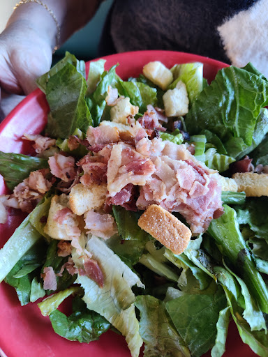 The restaurant is a stand alone lot with plenty of free parking. Unfortunately there is no lighting at the rear of the parking lot, which makes it very hazardous when walking amongst moving cars, especially if you have kids. The sidewalk adjacent to the building is difficult to walk on because the cedar trees next to them haven't been pruned in years and impede the walkway. The building's exterior needs some care because the paint in crumbling off the walls and cracks need to be repaired.