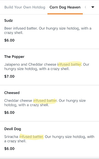 Giving them the benefit of the doubt, perhaps they had an off day on the first go round, we opted for delivery for our second go at it. Got the nice surprise of finding out their menus on the ordering apps are not up to date with what you'll receive. For example, if you order a corndog with something "infused" into the batter, you're actually getting a plain corndog with toppings poured on it. Theater cheese for theater prices a "premium" dog does not make.
