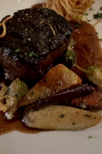 The Peppercorn Crusted Flat Iron Steak was a disaster. I requested my steak medium and what i got was a rare steak. I expect a little variance with steak but this was red and bloody throughout the whole thing. The peppercorns were way too overpowering and I had to scrape off a lot of it just to taste the meat. The scalloped potatoes were just bad. A compressed pile of potatoes prepared in a large tray then a square cut out and served. The bottom was burned and tough to cut through even with a steak knife and a few strips of carrot served on the side. Even the onion rings served on top of the steak were cold and full of grease like they had been dumped in a fryer that wasn't hot enough.