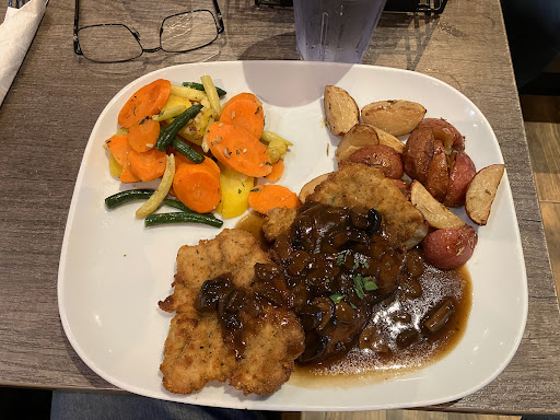 I ordered the Pork Schnitzel and it arrived presented like breaded pork chops in appearance. Thankfully, boneless. I'm sure I would have loved the sauce had I not just finished the soup, but that mushroom sauce tasted like they had used many of the same ingredients from the onion soup. It was a bit much, but I finished the sauce, pork and the roast vegetables that accompanied the meal. The red potato wedges were my favorite part, and I devoured them. I should note that I've had pork schnitzel in Germany, and these chops never saw the business end of a meat hammer. ;)