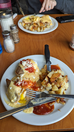 Read morePopped into this lovely spot after a recommendation from a coworker. We were welcomed as soon as we walked in the door. We both ordered a Benny that came with their homefries. The one at the top of the photo is their standard peameal Benny on a nicely grilled english muffin. I ordered a hot Greek Benny that had a slice of gyro meat and some vinegary pepper mash that paired well with everything. The homefries are excellent and this is the only local place we have found that still make them like this. They're boiled, chilled and then fried on the flat top grill to add some nice crispy edges. They were the first homefries to remind me of my grandpa's. Everything was well seasoned. Hollandaise was good, and the egg was soft-medium poached. We ended up having a lovely conversation with the owner and her cousin who had stopped by for a meal. There is unmetered street parking out front along Wyandotte. We will...