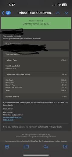 We decided to give Minos another chance and order take out delivery. My partner placed the order online and the instructions were very unclear regarding payment for the meal. When he called to confirm, the individual he spoke with sounded confused about our order. Once things were sorted out our food was delivered shortly after. The portions are great and the food was reasonably warm, however, my partner had specifically requested the chicken souvlaki meal without mushroom sauce, but when he opened the package the entire meal was smothered in the sauce. Additionally, the buns were just tossed into the bag. This experience didn't leave me very confident that care was taken in the kitchen during a pandemic.
