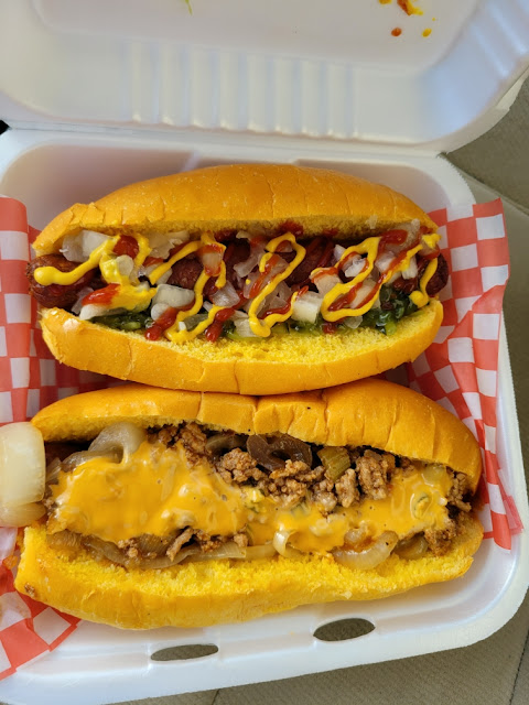 My husband and I ordered a poutine, the OMG dog (right) and the Chicago dog (left) and paid about $20 not including tip. For the size of the dogs that's pretty stinkin good! The fries were crispy and there was lots of gravy! The hotdogs are steamed but that's why we enjoyed them. Reminded us of going to the ballpark. The buns are big enough to hold all of the toppings (i still ended up dumping chili on my sweater lol) and were nice and soft.