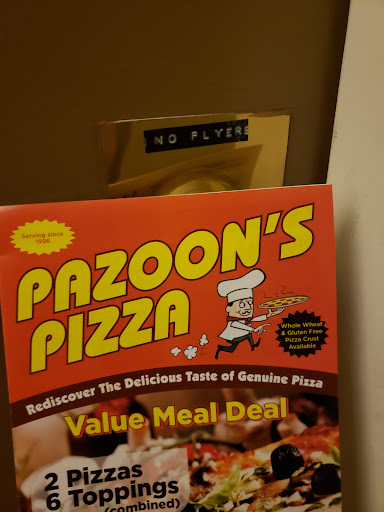 First time trying Pazoon's Pizza and we were satisfied. Prices are great for what you get and the food was pretty good. We ordered take out and got wings, pizza and a Greek salad. The pizza was good, not too salty, not skimpy on the toppings, not greasy at all and tasted good. The wings were also pretty good. The Greek salad, not really your typical Greek salad. Which would have been okay but definitely wanted the cucumber in it and there was none. Instead, it was a few slivers of tomatoes and lots of lettuce. Also, the onions was a crazy amount and there a lot of big chunks which I just threw out. Wished they could cut the onion thinly. But overall, not...