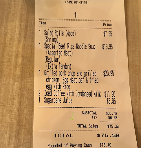 I ordered the house special pho and added extra tendon for the collagen benefits. The broth is great. When I tried to scoop some noodles, there was an overwhelming amount, and they were awkwardly tough at the bottom—kind of like when you order pho on UberEats and the noodles have been sitting separately before being added to the broth. Stirring them before serving could’ve helped a lot. The extra tendon wasn’t as much as I expected for the additional $4–5. In hindsight, I should’ve asked for it on the side to better gauge the portion. I also tried a bit of my partner’s dish—grilled pork chop with grilled chicken, egg meatloaf, egg, and fried rice. The chicken was good, the pork chop slightly overdone, and the meatloaf unfortunately unappetizing—about 50% of it went uneaten.