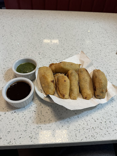 Paneer pakoda was round one. This was cottage cheese with green chutney in the center and a spicy batter. It came with two dipping sauces. One was green (probably mint) and the other was brown and sweeter. For a beverage, I had sweet lassi. It’s yogourt with chopped nuts.