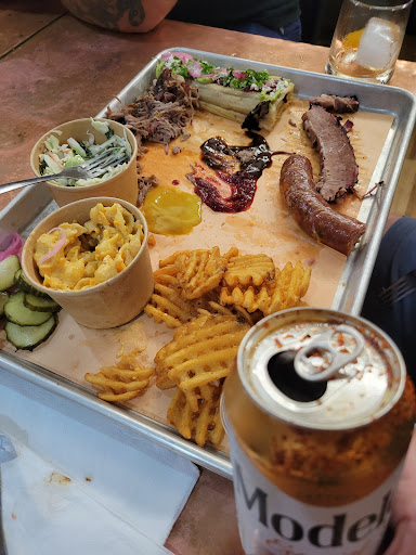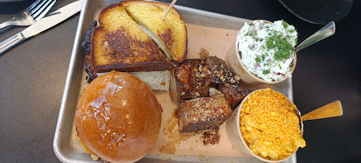The meats were across the board very good. The ribs were PERFECTLY cooked if you like them done competition style. Bite-meat pulls cleanly off the bone, not falling off the bone, but so juicy. The rub was basic, but thats all it needs, salt, pepper and garlic, maybe some onion. The smoke is treated as an ingredient, not the dominant note. It was a little under-represented however. No sauce on the ribs. My wife absolutely loved the pork sandwich. My boys inhaled their brisket sandwich/burger respectively. Big hits.