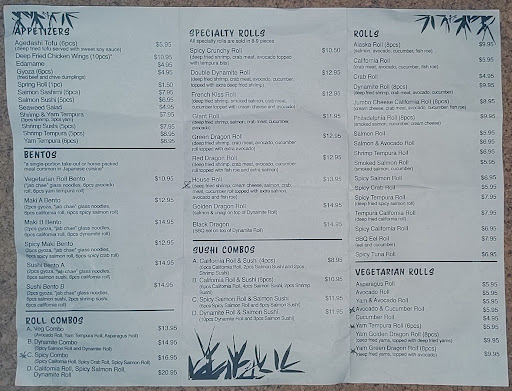 We ordered the following sushi, all of which was perfect and enjoyed by the experienced (and picky) sushi lovers, as well as those trying for the first time: Spicy Combo (spicy California roll, spicy crab roll, spicy salmon roll) House Roll (deep fried shrimp, cream cheese, salmon, crab meat, cucumber roll topped with extra salmon, avocado and fish roe) Avocado and Cucumber Roll Yam Tempura Roll Yam Green Dragon Roll (deep fried yams, topped...