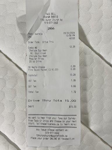 Ā Ā Ā Read moreI got a order on nov 20. When I got home & we went to eat our food was awful.ordered 2 chicken chalupas & a chicken quesedia, cheese fries, side of cheese & 1 lrg drink. All the chicken items were hard. They didn't change to fresh chicken. When I bit into it hurt my tooth. Had to throw away all 3 big items. Fries hard to. This was 4:30-5pm. I called very nice lady. Said she would replace whole meal & put my name in the book. She said I had 15 days. She apologized.....So today is day 15. I got there at 2pm. I tell the cashier. They are out of chicken but I wanted taco meat instead anyways. He goes back to manager says manager said your over 15 days. I told the young man he's wrong. I got my order nov 20. Today is dec5. Then manager says Im not in book. 3rd time manager comes says he has to call the manager & ask another day....um you are the manager. Not nice at all. Kept my receipt. Finally after I say Im calling taco bell itself he offers me 2 chalupas. I said no. He said if was under $10 different. I paid $24.98 to throw my stuff in garbage no. So in end I got 3 chalpuas (2 crunchy but soggy edges..3rd so hard sounds like a brick dropping on table), and a cheese fry. The cheese fries hard as hek tasted like cardboard. Replacement order awful to. Bad manager . Other emplyees were...