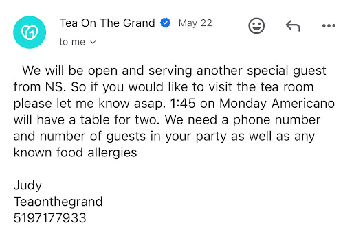 Today was my first time eating at Tea on the Grand and it was an amazing experience! I'd chatted with Judy two weeks before our planned visit that I was looking to surprise my Mom with one of their picnic boxes. We had a lovely chat on the phone as we planned which items she'd pack for us and the location where I could go for my picnic. This morning, I woke up, and the weather did not look nice for a picnic in Paris, but I figured we'd find a way to make the best of it. That's when I got a call from Judy. She, too, was worried about the weather and offered us a spot in the sunroom at the Main House and said she'd also be including a small cake for my Mom's birthday. In that phone call, my faith was restored that there are good people in the world, and I actually started to cry, knowing that my surprise for my Mom was going to be magical like I'd hoped. The food was delicious, the atmosphere was perfect and Judy and her staff member were good about checking that we had everything we needed. I will forever remember this kind gesture and will for sure be back again. Thank you so much, Judy, for all that you did today. You are an...