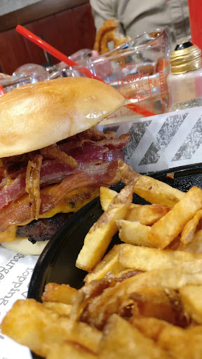 ย ย ย Read moreWe were celebrating a friend's birthday, so we were a good sized group. We didn't have reservations and we were there very close to noon but we didn't wait long for our table at all. After we were seated, our server explained the menu to us, which is a necessary step since, like the burgers, it's HUGE! There is an endless choice for burger toppings and you get to choose your bun and protein and yes, even vegetarians and gluten-free folks have choices. A couple of our group ordered the 6 Degrees of Kevin Bacon burger and if that's not enough bacon for you, then you should probably check yourself into bacon rehab. I ordered the a peppercorn crusted burger and when they say peppercorn crusted, they aren't kidding. It was pretty fabulous. The burgers are enormous and they are served with generous portions for the sides, so it's a big meal. Only the big eaters in the group managed to finish it all.