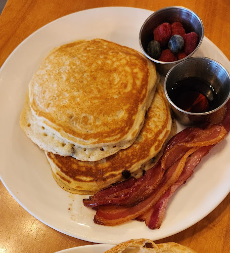 Ok so I do want to say the staff was so lovely and welcoming (every time I've gone to the bakery they've always been the same). That being said, that's kind of where the loveliness ended for me. I have eaten here a couple times in the past few years (their mac and cheese is so good but i usually just buy it from the bakery to reheat at home). Past experiences were pleasant and I really wanted to love my visit there but I just did not. I got there at 830am so I was lucky to be seated right away. However, it took an hour from the time I was seated for my food to get to the table. 'The traditional' was so so. I got it with ham which was good but could have used some more potatoes to be honest considering the price. The ketchup that came with it was very watery so I didn't eat it. The jam was really good, however the bread (I asked for it not to be toasted) was still kind of hard which was unexpected and disappointing since it's a bakery. Now the pancakes - these were pretty disappointing. It was an extra $2 to add chocolate chips and they only threw a few on one side of the pancakes. And then one of them was raw in the middle. Now I understand things happen and they did attempt to rectify it when I asked for a replacement pancake BUT it took another 20 minutes for them to bring me the replacement pancake AND there was no chocolate chips in it. Considering it was $19 for the chocolate chip pancakes with a couple slices of bacon ($17 plus $2 upcharge for chocolate chips), the experience could have been much better. All in all it was "ok". The parts that were good, were pretty good. However, for the price, all the waiting, and the mishaps, the good just unfortunately wasn't good enough to make up for it. I did not want to be harsh and give only 2 stars so I gave 3 since half stars aren't an option. I will continue to go to the bakery to support becuase they really do have some delicious items in their bakery but I don't think I'll be back to eat here...