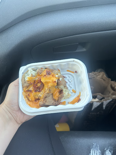 I hate to do a bad review but from the service to the food quality this was rough. There were only 2 people in front of us in line, but it took 10 mins to get to the cash. I'd recently downloaded the Wendy's app and had a free chicken nugget, so I ordered at the counter and they tried to scanned my phone to get it. After several attempts and trying another computer they got it to scan. After 10mins waiting for my potato and burger, they tell me my food's ready, and I ask about the nuggets- it hadn't gone through, so I agreed to wait for them to cook the nuggets. Once the nuggets were ready, the cashier told me I would have to pay for them. I told her she had scanned the app and it was free, then another staff told me that I would have to pay. I told them respectfully I wasn't going to pay for them because I'd already paid for my meal and they should've been included in it. Then they went to get their manager who was able to process it through since I'd already made the purchase to have the nuggets included. The whole hoopla was over 20min, the complete opposite of fast food. And in the end, my potato had barely any cheese sauce and was just about undercooked (second photo is after I took my first bite- all shredded cheese, maybe 1tbsp of sauce on/under the whole potato.) I watched the guy working the potato station literally smash it flat with his hand, instead of slicing and opening the potato like they normally do. Wendy's bacon and cheese sauce baked potato is my favourite fast food item of any joint, so I was very disappointed. (If we weren't on a road trip, I would've gone back in to complain once I saw the potato.) To speak to the service/food quality, while we were there, 4 out of the 5 customers who were served while I was waiting also went back to the counter to complain about missing items (one woman even came inside from the drive thru.) Wendy's is great usually, but I'd definitely skip...