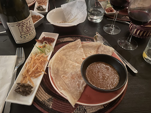 The 5 course meal exposed us to so many new flavours and mixes of flavours and textures, which were enhanced by our host's suggestion that we eat as much of the meal as we felt comfortable with with our fingers. Before we began to eat, our food servers came to us with water and bowl and poured water over our hands so we could be cleaned and comfortable eating without utensils. (Of course there is also hand sanitizer available for those who want to be certain.) I would urge you to try this, as beyond enjoying the taste and mouth-feel of the food, there's an entire extra dimension to having the tactile sensations associated with handling the various courses.
