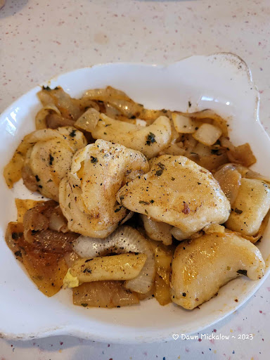 We chatted, and she delivered our drinks (without straws). Just as my Dad was going to ask, she pulled out 2. And asked us if we were ready to order. We were. He ordered the BLT on white with coleslaw. I ordered the Perogies with fried onions, NO BACON, and sour cream. š