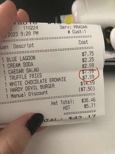 My girlfriend and I went last night to celebrate our 1 year anniversary. We know it's not that fancy of a place but we are broke university students so we decided it was nice enough. When we first went in it seemed like it was going to be a good night. We got our menus and drinks relatively quickly and even the wait for our food wasn't to bad. This is where it all went down hill. I wouldn't say I'm a picky eater, especially since I am paying for the food and as I mentioned before, a broke uni student. Despite this I still couldn't finish my salad or burger. My salad was the most bland caesar salad I have ever had, and I love caesar salad so that was disappointing. And my burger was so covered in sauce that it fell out of my bun multiple times. I even tried to take some of the sauce off it with my fork, still fell out so I gave up on it. My girlfriends chicken parm was okay, she had giant chunks of onion and tomato in hers but she didn't mind it and brought it home to pick out the onion and tomato there. The only GOOD thing we ordered was the truffle fries. Then we were done "eating" out food we decided to order dessert. We ordered the brownie with ice cream. What wasn't disclosed on the menu is that the brownie had nuts in it and I'm allergic to nuts so I couldn't eat the dessert we were supposed to share. At this point the time between our server coming to check on us was taking longer and longer, which as weird because we had like 3 servers and there were maybe 7 people in the restaurant total at the time. When our waiter eventually came to see how things were going I asked him if I could get a partial refund since I didn't finish either of my dinner items and couldn't eat my dessert. He went and got the manager to come talk to us which gave me a little bit of hope, that didn't last. The manager came and talked to us and so I told him the situation and he offered to get us something in compensation for the food I didn't eat. Since we liked the truffle fries we ordered that and the white brownie since it didn't have nuts in it. Now when a manager asks if there is something they can get you to compensate for you bad experiences you think that would mean they are free, that would be wrong. As you can see from the picture below I was charged for both of them. Now they did take the brownie off the bill and discounted my burger, but after doing the math I still payed them an extra $1.50 from the fries and brownie. Then we spent, not kidding or dramatizing, 30-40 minutes simply waiting for our server to come over so we could ask for the bill. We spent a total of 2.5 hours in that place, half of which was spent waiting for our water so we could proceed to our next step of our night (finished eating and waiting for dessert, finished dessert and waiting on the bill, things like that). Over all this was the worst experience I have ever had at a restaurant and will be telling people not...