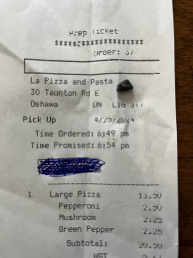 On the more negative side: We live close to this restaurant, near Taunton and Harmony in Oshawa. About 3km from La Pizza. When the order was placed for delivery, we explained what we wanted and where the pizza was to be delivered to. We were given a total of $23.45.