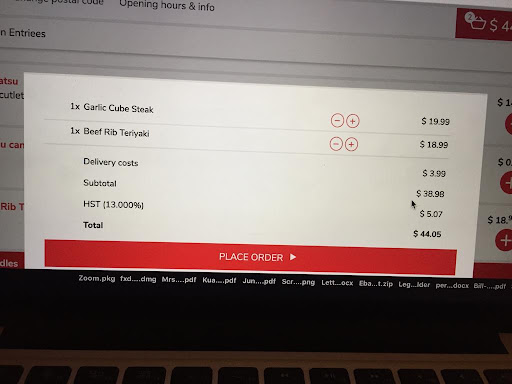 Price: Initially when we saw the price of the garlic cube steak and the beef rib teriyaki both were priced $19.99 and $18.99 online. We decided to pickup the food since it was relatively nearby. When we had reached the restaurant and paid, the receipt we got back charged us $46.31 instead of $44.05 meaning we were charged an extra $2.26. We didn't notice this overcharge in the order until when we decided to order an extra eggplant from their menu which costed $4.99($5.63 HST included) but realised we were being charged $7.90(HST included). Both our receipts did not include a breakdown of the cost of their items so when we asked if we could get a breakdown for the cost and why we were being charged more than what was stated in the menu. They said their menu was 2-3 years outdated and told us to look up their prices ourselves online. This is a restaurant that can't even be bothered to update the pricing on their menu for 2-3 years.