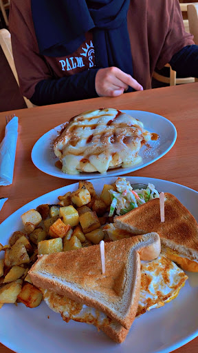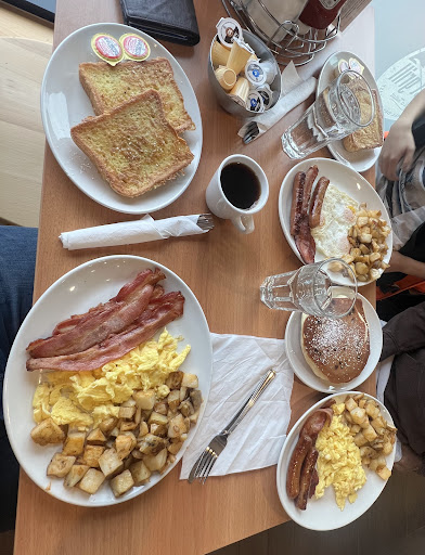 The service here was so bad that it was funny. From the beginning our waiter who met us at the door was dressed even more causal then us, we thought he was a customer. Then he led us to a table before changing his mind and bringing to another table where we sat. The table was kinda sticky but atleast it wasnt covered in crumbs. Then without giving us any menus about 2 minutes later he came asking for our orders. We havn't even been asked if we wanted something to drink. Upon noticing we had no menus he promptly took some from an empty table and gave us about another 2 minutes. Still no inquiry about drinks. About five minutes after placing our order he shouts from the counter asking if we want something to drink. We reply water, the water never comes. About 45min later our food arrives which is laughable timing at best since we and one other table was the only one occupied in the store. Both my friends got strip bacon and it was horribly overcooked, we also weren't given utensils originally. Our waiter corrected this problem grabbing a handful of utensils and handing it to us with one hand while using the other to talk to his buddy on his cell phone. Like lol who does that, how is this allowed. My friend near the end of the meal asked when the water was coming and our waiter finally brought 2 glasses... for three people. I guess this is what you get for coming to a breakfast place at 2:30pm on a Saturday. We're never...