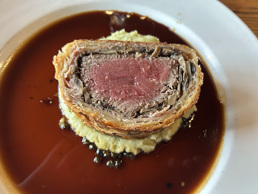 The dishes were cleared and, well as is the case with crispy bread, many crumbs littered the table. Steak knives were brought, and we were again asked if we wanted the wine with the next course (again, it’s the pairing). Yes, we would like the next wine. R brought a red wine and again plunked it on the table and ran off. Our beef wellington arrived, and we had to ask what the wine was that was delivered. R didn’t know and went to the hostess station to read from the menu. He returned and said “an Italian wine from . Good with Beef.”