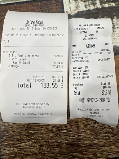 Read moreChatGPT said: Ariana Kebab House in Ottawa is an outstanding Afghan restaurant that provides an unforgettable dining experience. Our group recently had the buffet, and it was absolutely amazing. The selection of dishes was diverse and delicious, offering a true taste of Afghan cuisine. Every dish was flavorful, with rich spices and unique textures that left us all wanting more.