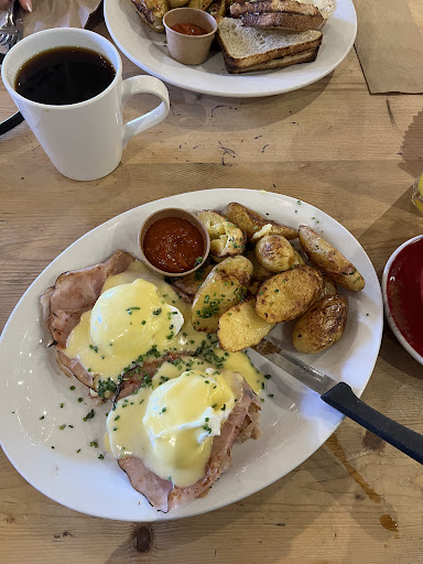 I read some of the reviews before coming here, and came with an open mind. We got here at 10am and figured out the whole seating arrangement within a minute. It was not difficult in my opinion. One line is dine in, one is dine out. I grabbed us a table and told my wife what I wanted she ordered and brought us our order flag. She was in line for about 10 minutes. I originally got orange juice as they were very busy at the time and couldnāt make latteās. The orange juice was very fresh, and my wife had drip coffee, black which was really good coffee! We waited about 15 minutes for our food, and before it came one of the staff asked if we wanted any latteās as it slowed down and they could make them now. She also apologized and offered them half off. I found that to be accommodating, and ordered a pumpkin spice latte. The latte, was perfect creamy, frothy, and warm. Our breakfast came, and it was delicious! The hollandaise sauce was perfect and creamy, the eggs were soft and burst, and the English muffins were nice and toasted without being too crispy and soaked up all the sauce and yolk wonderfully. The roasted potatoes were a big hit too, and the ketchup was delicious not sure if they make it but itās very tasty! My wife loved her breakfast plate. One of her eggs was broken so she got three, no complaints here. Her bacon was fantastic, sweet and salty, very strong maple flavour it was lovely. She got the sourdough bread and it was really good, and went very well with the egg. In addition we also got a loaf of cheddar jalapeƱo bread, which is divine! All in all we had a great experience here! Yes we spent roughly $65 for breakfast (thatās including the loaf) thatās expensive, but I donāt mind paying for good food, and the food here is delicious. In my...