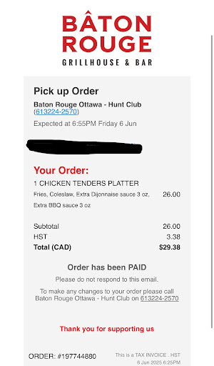 As Baton Rouge advertised on their website "Bâton Rouge has been serving quality, fire-grilled food and delivering an unmatched experience with attentive and friendly service. Today, twenty-eight Bâton Rouge franchises bring their passion, masterful grill skills, and quality food to each of its locations in Quebec, Ontario, and Nova Scotia." MAYBE SOME DAYS BUT THIS WEEKEND YOUR QUALITY OF SERVICE MISSED THE MARK.