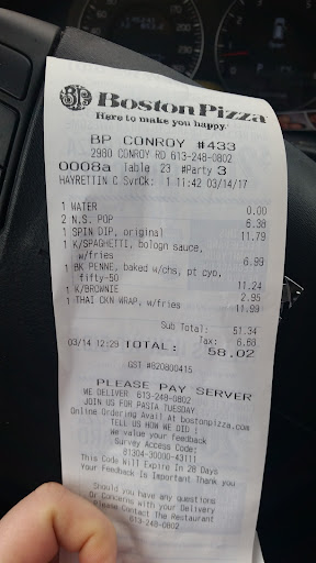 Read moreSo this isn't my first time at a BP, buts it's only my second time at this location. I'm usually a Barrhaven Boston Pizza customer(and love it), but we were in the area, so we thought what the heck! We walked in and were immediately greeted and seated near the TVs because we wanted to watch a specific soccer game. They didn't have the channel that played the game, so the waitress gave us the wifi password(very kind of her). She promptly brought us drinks, and took our order. We ordered a started, one of their new fire grilled pizzas and the Big Dipper. Our starter came quick and was hot. The food came and seemed to be okay. It really wasn't until my husband was two slices into his pizza that he offered me a piece and I looked at it and noticed that it wasn't the right pizza!! The waitress came at that moment to ask if everything was alright, and I pointed out that the pizza was wrong. She checked what was punched in and she had punched in the correct order so it was the kitchen staff who messed up. At this point we're like ok.. he's eaten a bit out of it so we'll deal with it I guess. The waitress said she was going to take the plate to the kitchen staff and manager and point it out. She came back a couple minutes later with the plate and said she talked to her manager and he'll take care of it. We get our bill, and guess what? $1.95 off. I asked the waitress what had happened with the kitchen staff? I was just curious .. she looked at the receipt and was shocked. She said she talked to the manager about it and thought he was going to take care of it. She was just as annoyed as us. I just mentioned that If someone was allergic to something and this happened they'd be in a lot of trouble-- now my husband's feeling sick. She didn't know what to do- she apologized several times and was noticeabley annoyed. Never going here again! The waitress was wonderful but that manager was just ridiculous .. kept giving us the oddest of looks every time he passed us after the waitress pointed out the mistake. I guess I'll just stick to the Barrhaven location, because management here just doesn't know what customer service is. I'm not cheap-- but it's the principle. It's very risky letting this stuff slide. Meh.. what am I...