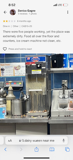 Read moreI went to this Dairy Queen this evening with my partner. We were there for over 30 minutes from standing in line to leaving right after receiving our ice cream. Not only did we have to wait forever to get our ice cream it was wrong. A customer who ordered after us took our ice cream order and when I tried to say something I was ignored. Then 2 more customers who ordered after us got their ice creams and ours were forgotten. When something was said they offered to make them right away however they came out wrong. My partner ordered a small and received a mini and my flavour was wrong. Was very disappointed in the wait time along with the staff not seeming to care about the wait time and that the fact our order was taken from someone. There was no offer for our money back or larger size blizzard. Instead I paid more to get less blizzard as they decreased the size from what we actually ordered and paid for. We were so upset and frustrated that we wanted to leave asap. Definitely not impressed. While waiting we were reading the reviews and saw one that perfectly summed up the state of this Dairy Queen. (See...