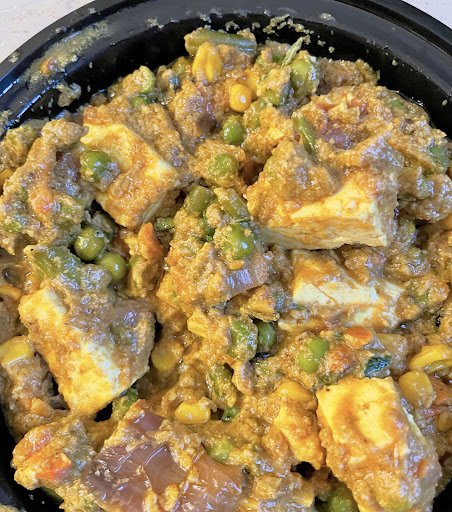 On opening this dish, we saw chunks of paneer cheese inside. It was really a cheese dish with veggies.