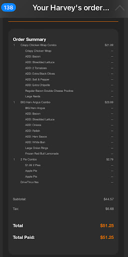 Read moreI just went to Harvey’s recently & ordered a meal, when I pulled up to the window I asked to order some dipping sauces and expected there to be a charge, however the lady charged me $2 for 2 dipping sauces which is ridiculous for dipping sauces which are usually just free or maybe 30 cents each. They lady serving me just asked how many I wanted & charged me for them without telling me the price before hand. When I paid, I checked how much it was and realized I payed almost $3 more than my original price which didn’t make sense because I had only order two dipping sauces.