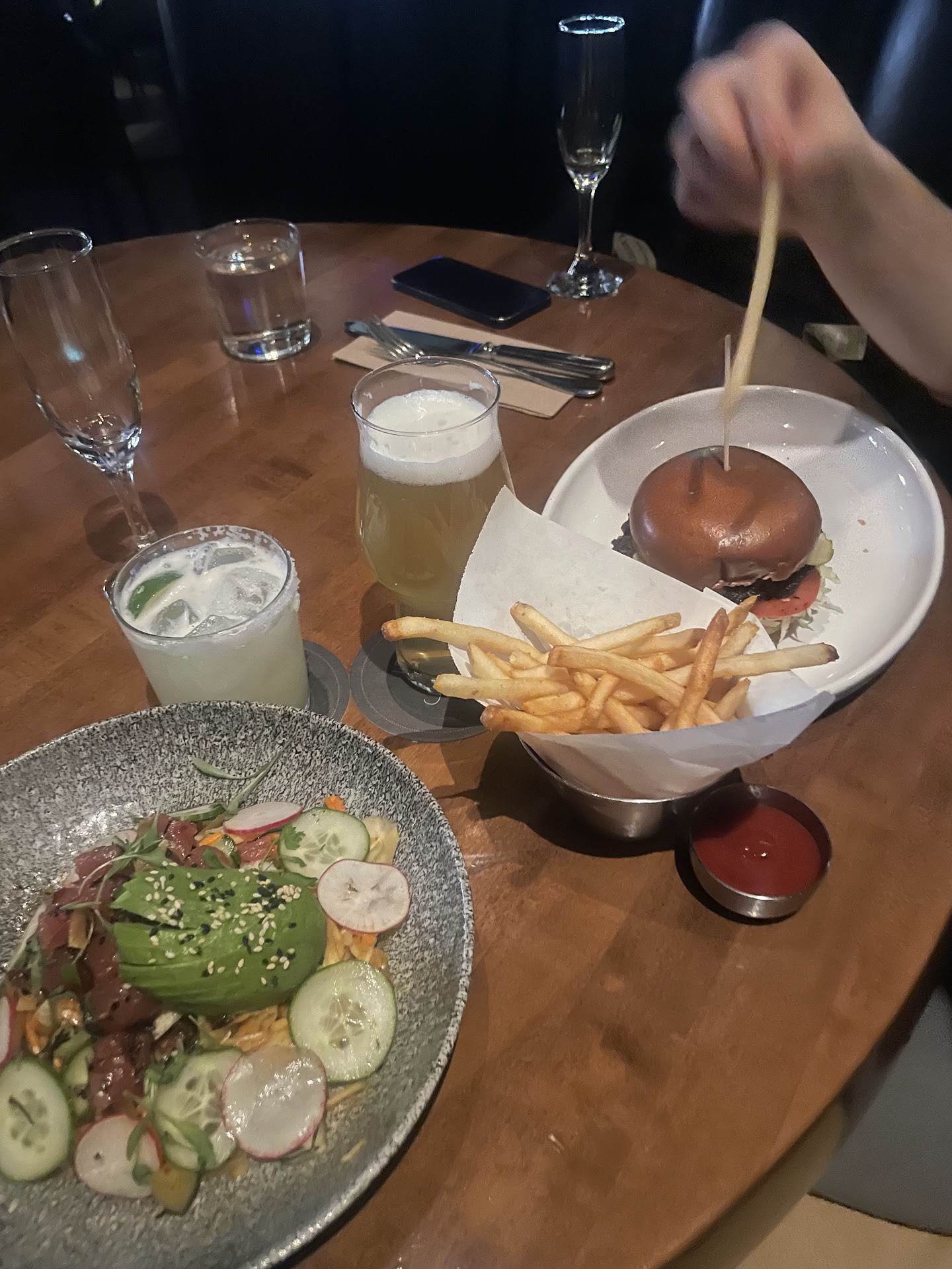 Equally impressive was the hand-pressed beef burger. Crafted with care and expertise, each patty showcased the quality of the ingredients and the mastery of the culinary team. The beef was perfectly seasoned and cooked to perfection, resulting in a burger that was juicy, flavorful, and undeniably satisfying. Accompanied by a medley of fresh toppings, it was a classic reinvented with finesse.
