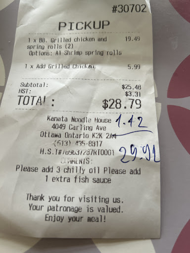 Read moreThis was originally a 5 star post. However it's now been altered to a 2 star post. Kanata Noodle House ( Carling) was once our go to for Pho and Vermicelli. After making reservations on Friday 01/11/2019 for a very important family gathering on Saturday 02/11/2019 we received the absolute worst service and I was embarrassed to have chosen this restaurant. Our reservation was "lost" even though the young lady who took it down ( who was very sweet) was so excited at the thought of us celebrating at Kanata Noodle House. A member of my family had to text me to ask how many people were on the reservation, as when they arrived, our reservation was no-where to be found, and by the looks of things the tables I had originally reserved were taken for someone else's party named "kim". We ended up getting the table we usually see staff and family eating at during less busy times, right by the kitchen door. The woman who ended up waiting our table seemed like a manager or owner, clearly did not want to be there and was sour the entire time. 2 hours for pho! 75% of that time was us waiting. We saw countless wait staff run past us , only for us to be forgotten and ignored. We asked for more tea and she forgot about that, only to remember again 15 minutes later when I kept playing with the tea pot loudly when she walked by. I tried to stop her a few times, but she would power-walk past us into the kitchen and avoid all eye contact. I still left a 10% tip, and I feel even then I was very generous. I think we are going to be looking for a new noodle house now. Very...