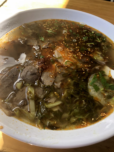 BRAISED BEEF SOUP I ordered a large bowl of they're #4 size noodles, not sure what they call them but it's the fourth picture in the menu for noodle size chart. The noodles were VERY tasty, fresh, a bit chewy but also soft texture. The beef isn't a cheap cut of beef with a thick tissue lining on it but luckily mine was cooked long enough to be soft enough to eat, but nothing crazy tasty, just fall-apart beef. Lots of cilantro, onions, decent broth. The tables all have a small bowl of toasty sesame flavoured chili oil, it smells and looks homemade but I didn't confirm with the waitress. There's also some black vinegar to help cool off the heat if you add too much spice. The noodles were the best part and I will try to order a dry bowl next time.