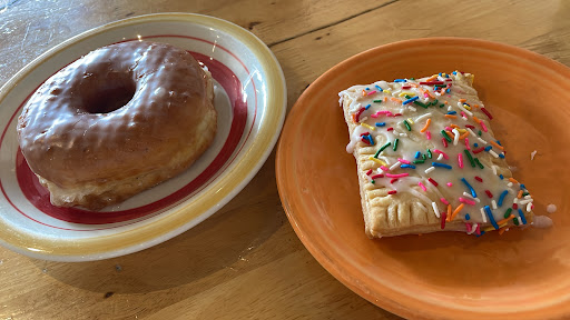 #1: This is a nice coffee shop/ bakery/ weekend brunch place. I had the coffee + scone combo, which was $3.50 with a medium coffee. The scone was tasty (it was honey nut), very firm (almost crispy) on the outside, soft inside, and the honey on top was perfect. The Happy Goat coffee was delicious! They have a decent sized seating area, occupied mostly by tables (convenient for breakfast), but by the window there are several comfy chairs. They also have a cafe table or two outside on the sidewalk. They have locked Wi-Fi. I didn't note if they had any outlets. The washrooms were cute and clean.