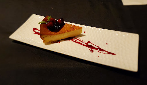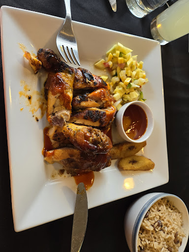 I had the jerk chicken with mango salsa, a ginger beer and the day's cheesecake special. The ginger beer was quite sweet and not so gingery as to taste hot. The jerk chicken was mildly hot, spice wise but came with a bowl of jerk sauce for dipping so you could add more jerk heat to the flavor. The mango also was basically just dry, cubed mango so nothing special. The temperature of the food could have been better. The chicken was warm, not hot and the plaintain was barely warm. And two small pieces of plantain seems skimpy for an $18 dish. The only thing that was actually hot was the rice and peas. The cheesecake though was quite tasty and well worth the low price.
