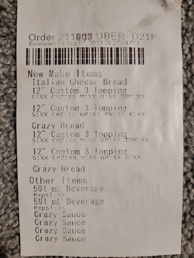 Read morePicture below was my order got it an hour and half later , missing 2 crazy sauce and a crazy bread , called and explained was told I understand 2 options .