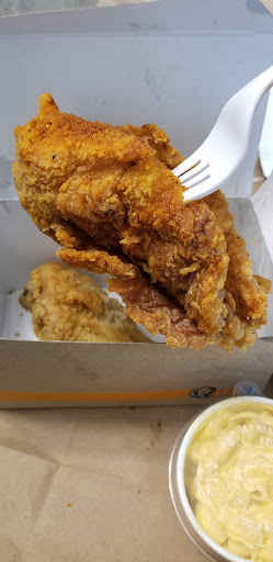 Went in on a rainy Sunday afternoon (around 2pm) with my husband, son and my father in law. There was already a line-up of 2-3 people when we arrived. There was only 1 order taker behind the counter and 2 people in the kitchen. As soon as I stepped up to the counter to place my order (first time in MANY years!) I deduced that they were delayed. Ceres (the order taker) was very friendly and honest, stating that due to supply chain issues, that they were low on options for pop and drinks AND had no more coleslaw. I mentioned that we were dining in, she promptly checked our vaccination receipts and ID. I ordered their two piece meal, my son had their large poutine, my husband had their Big Mary Combo and my FIL had their apple pie. We all had carbonated drinks. She gave the option of getting a gravy or mac and cheese on the side with my chicken and taters. I am very glad I got their gravy. There was quite a wait for the food with many folks standing around for 15-20 minutes for their food (mainly take-out). Apparently it was due to the fact that there were several orders for multi-piece meals AND the drive thru volume was fairly steady as well. Once we got our food about 15 minutes later, it was piping hot, with LOTS of crispy taters. Their gravy is good, not salty, as the taters and the chicken were salty enough on their own. I observed Ceres, the order taker, deftly manage both the drive thru and all of the walk in orders, including a couple of demanding customers who came in after us and wanted their orders sooner. Kudos to the crew, but it was clear that they were not only understaffed, but under-supplied. I am not sure about how experienced the kitchen staff were, but Ceres could tell me that they had been open since April 2021, and have been quite busy since. I can't wait for the Orleans location to open!! I want to try their...